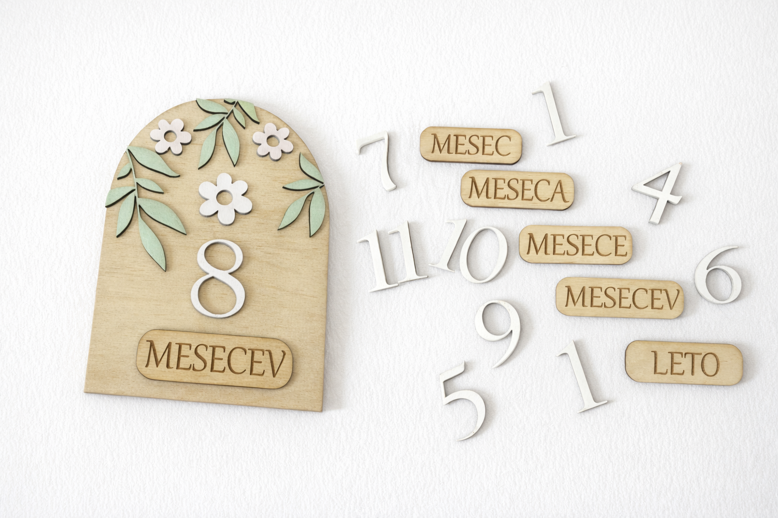 Kartice so izdelane iz kakovostnega naravnega lesa in okrašene z nežnimi cvetličnimi motivi v umirjenih, naravnih barvah. Brezčasen dizajn je primeren tako za deklice kot dečke ter se lepo ujame z različnimi fotografskimi ozadji.