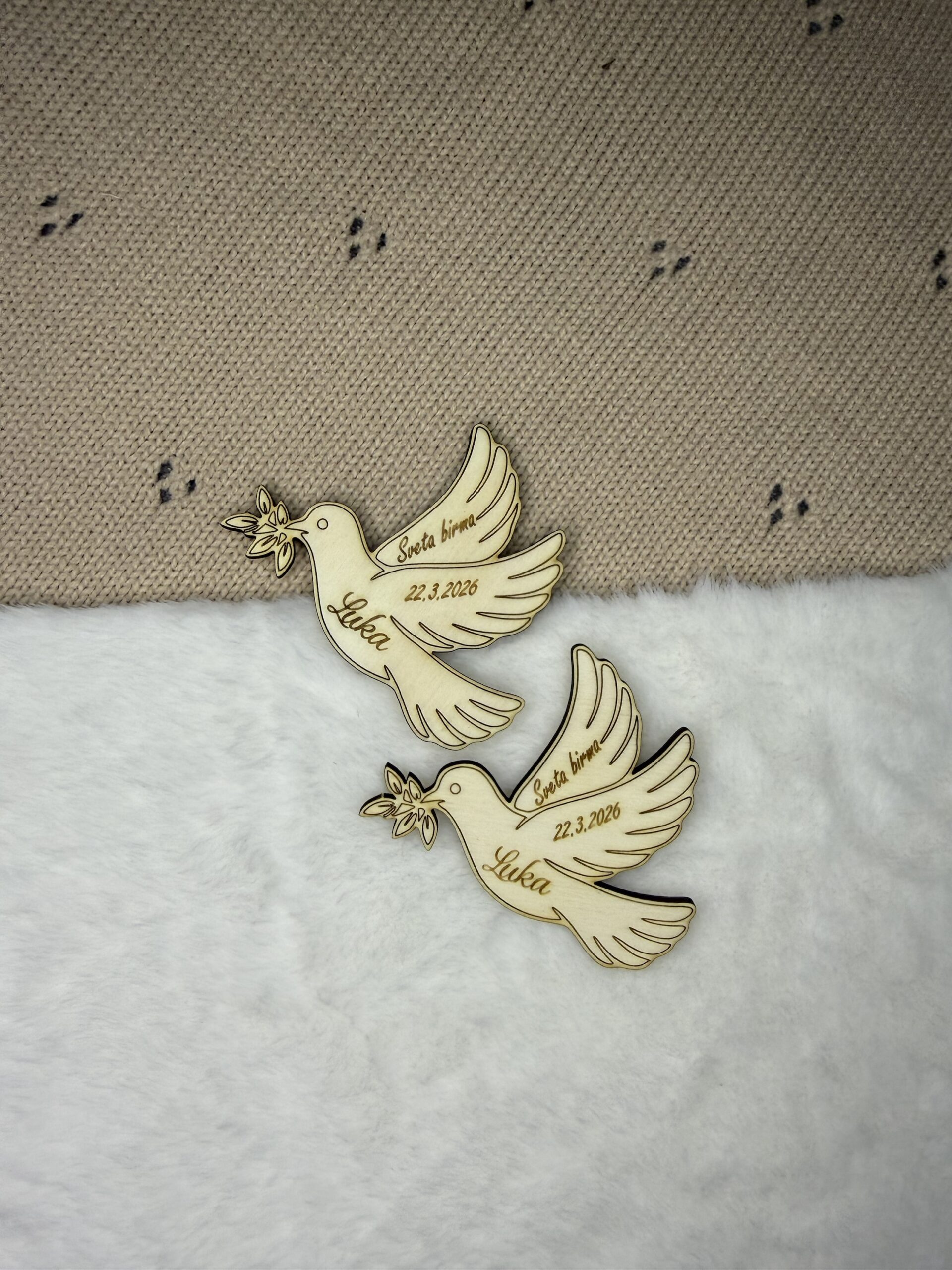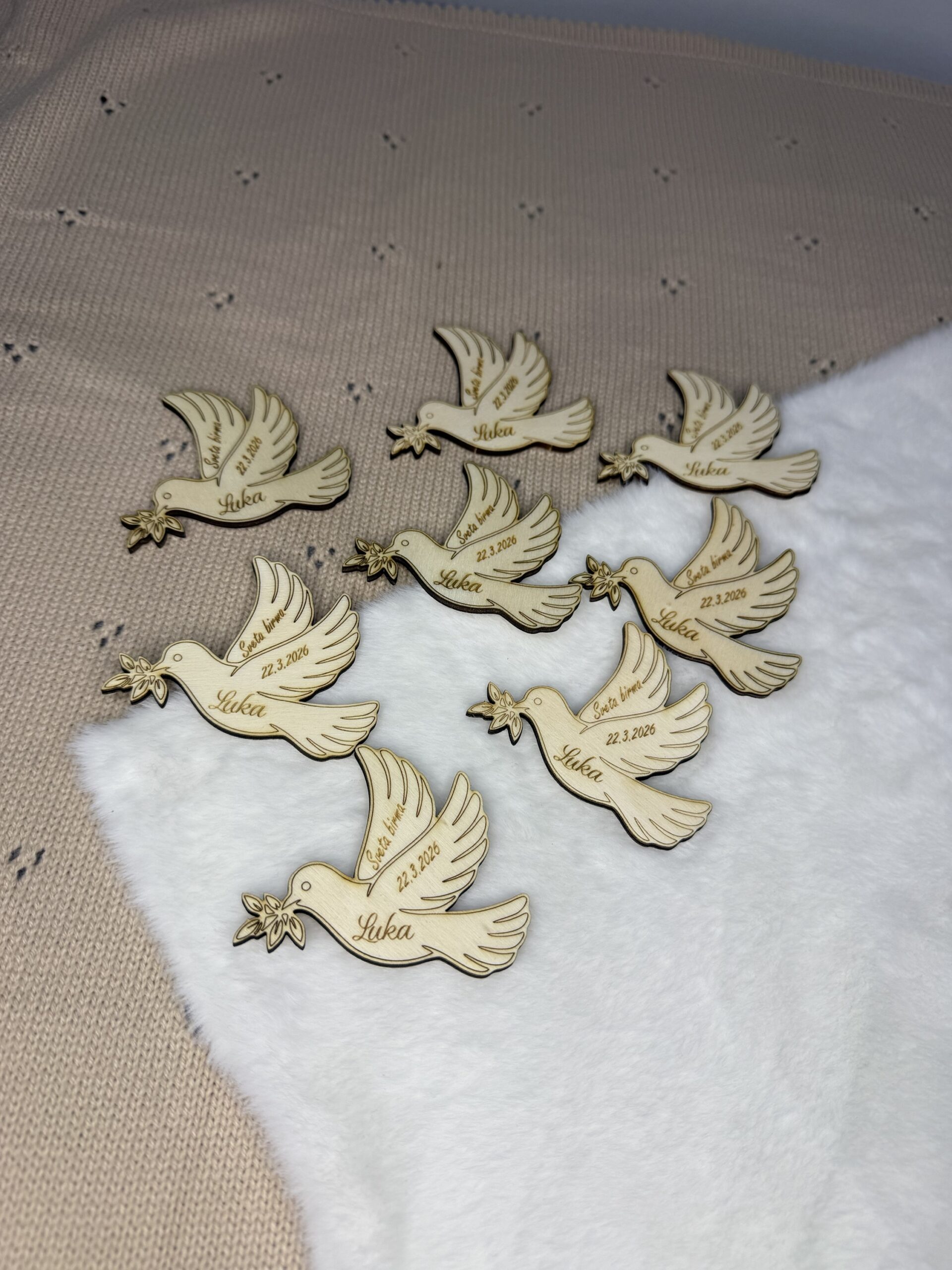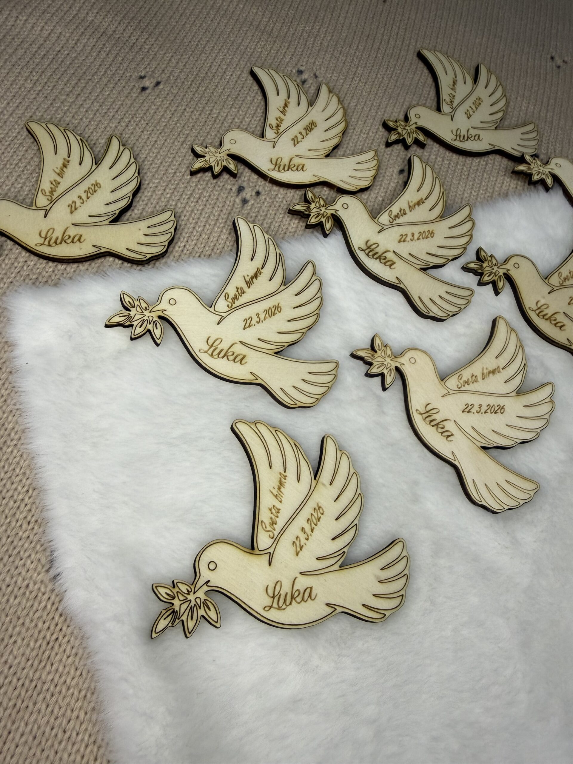 Lesen magnet v obliki goloba iz topolovega lesa s personalizirano gravuro je čudovito darilo za goste ob krstu, prvem svetem obhajilu ali birmi.