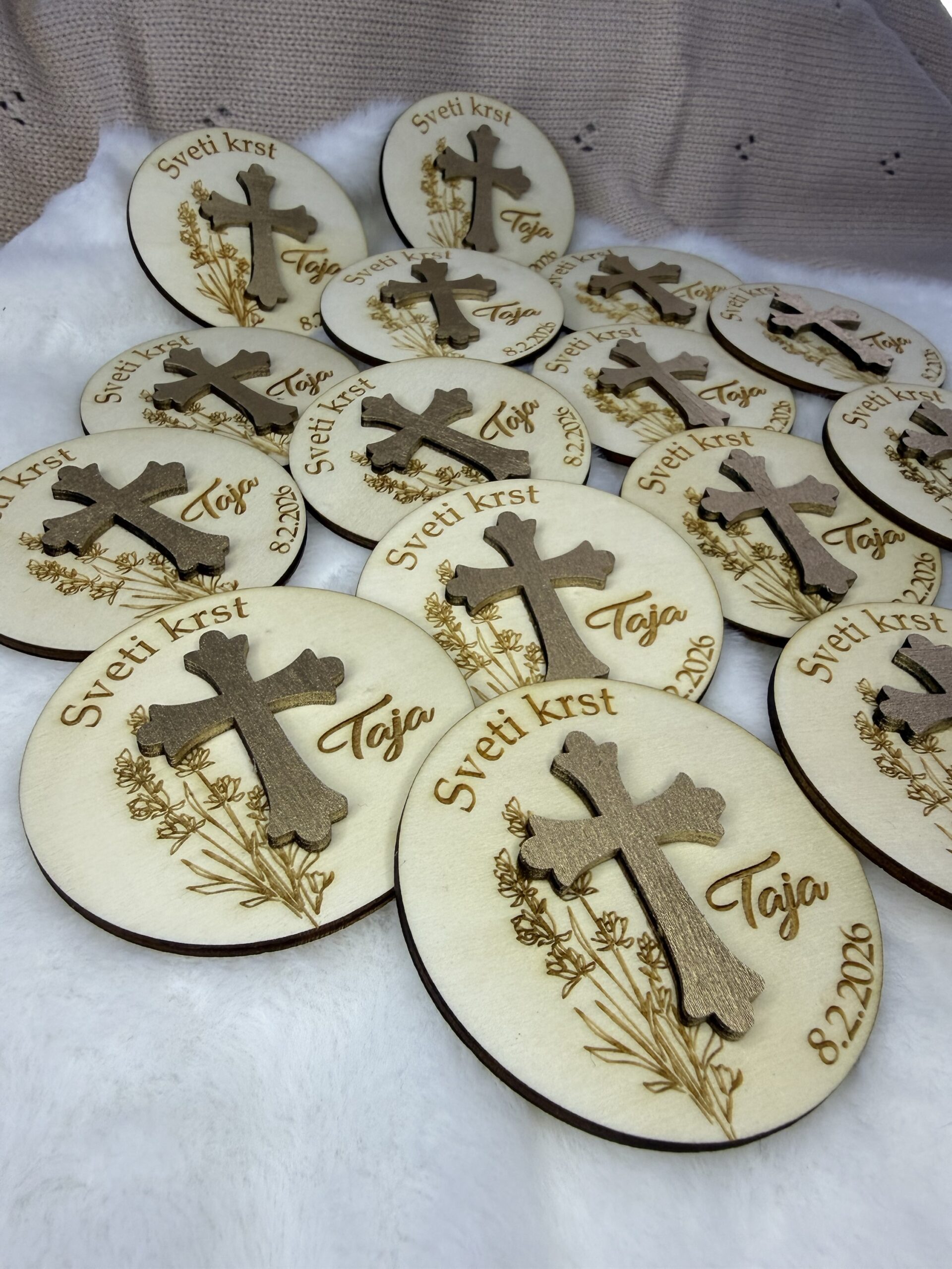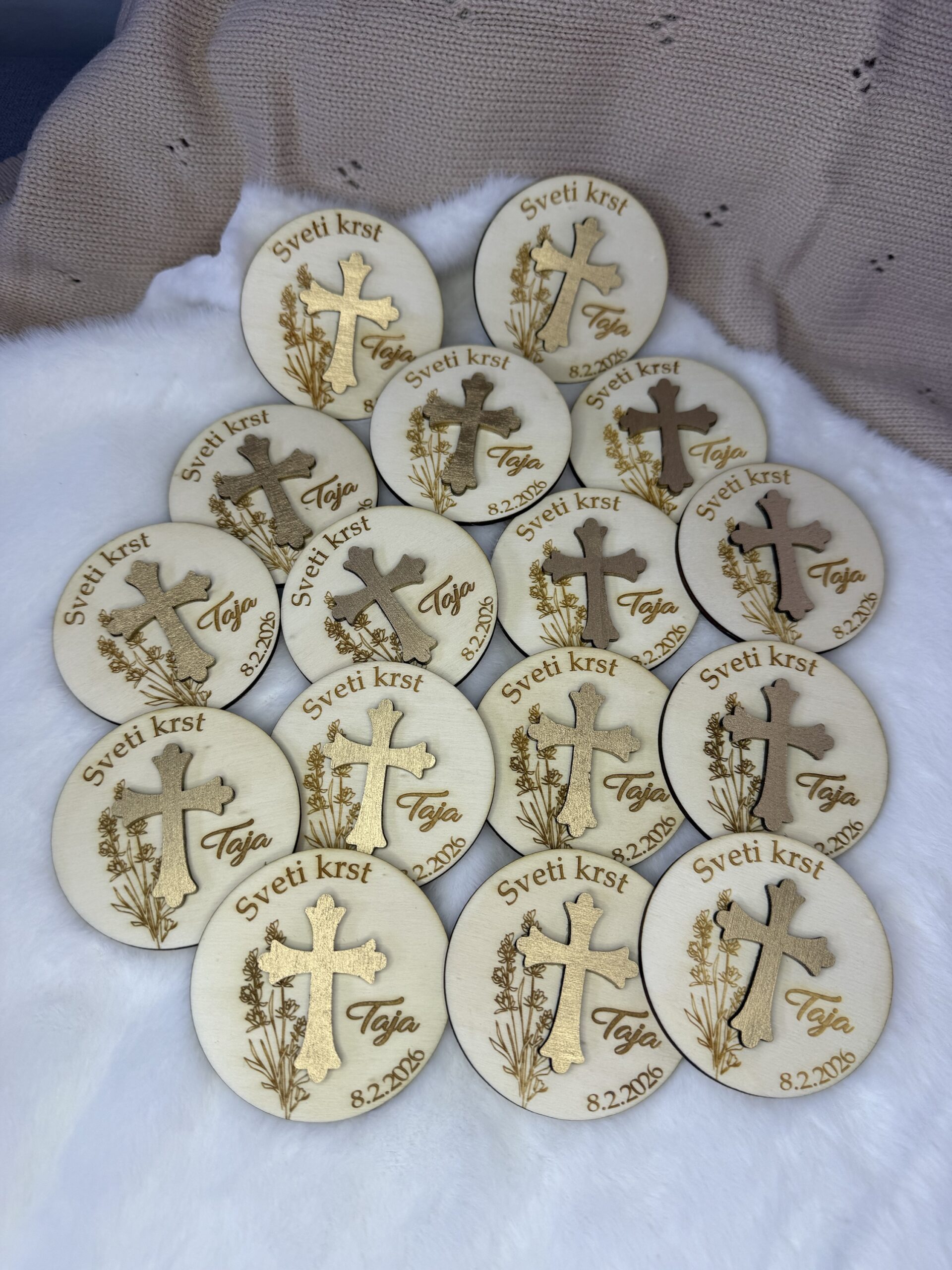 Lesen okrogel magnet s križem in nežnimi graviranimi rastlinskimi detajli je simbolno in elegantno darilo za goste ob pomembnih verskih obredih. Izdelan je iz kakovostnega topolovega lesa debeline 3 mm, z natančno lasersko obdelavo in naravnim, toplim videzom. Na zadnji strani je nameščen magnet, primeren za pritrditev na hladilnik ali druge kovinske površine.