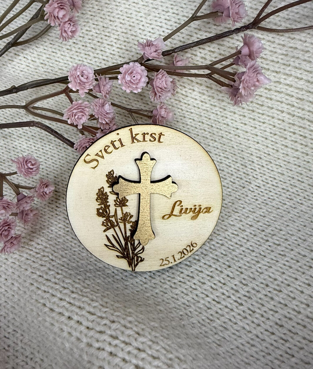 Magnet je personaliziran z imenom in datumom, zato predstavlja edinstven in trajen spomin na poseben dan. Križ kot osrednji motiv simbolizira vero, zaščito in Božji blagoslov, rastlinski motiv pa dodaja nežnost in eleganco. Na voljo je s križem v zlati ali srebrni barvi.