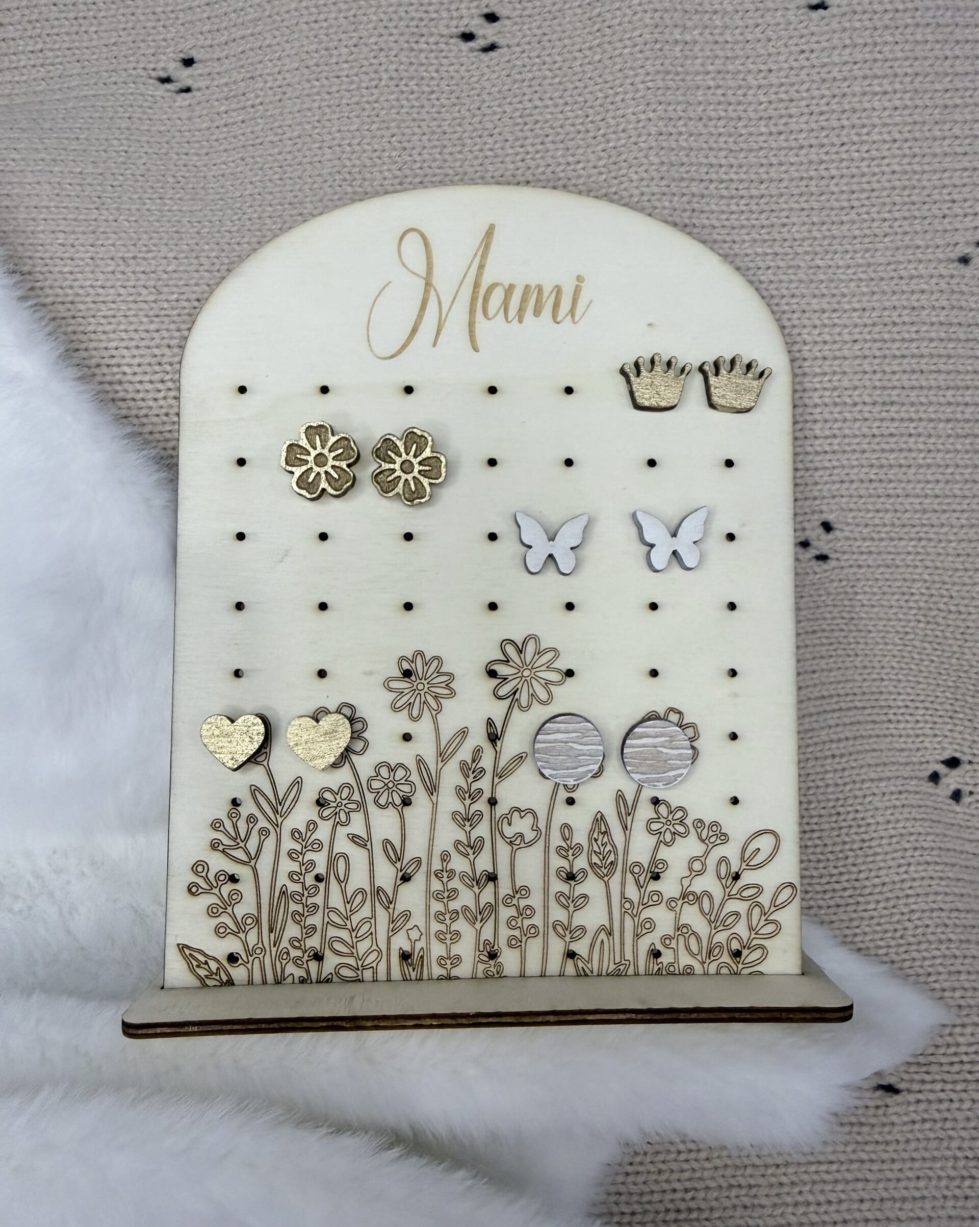 Elegantno in nežno oblikovano leseno stojalo za uhane je čudovito darilo za mamo ob materinskem dnevu, rojstnem dnevu ali kot drobna pozornost iz srca. Na vrhu je izpis »Mami«, spodnji del pa krasi graviran cvetlični motiv, ki izdelku doda toplino in pridih narave.