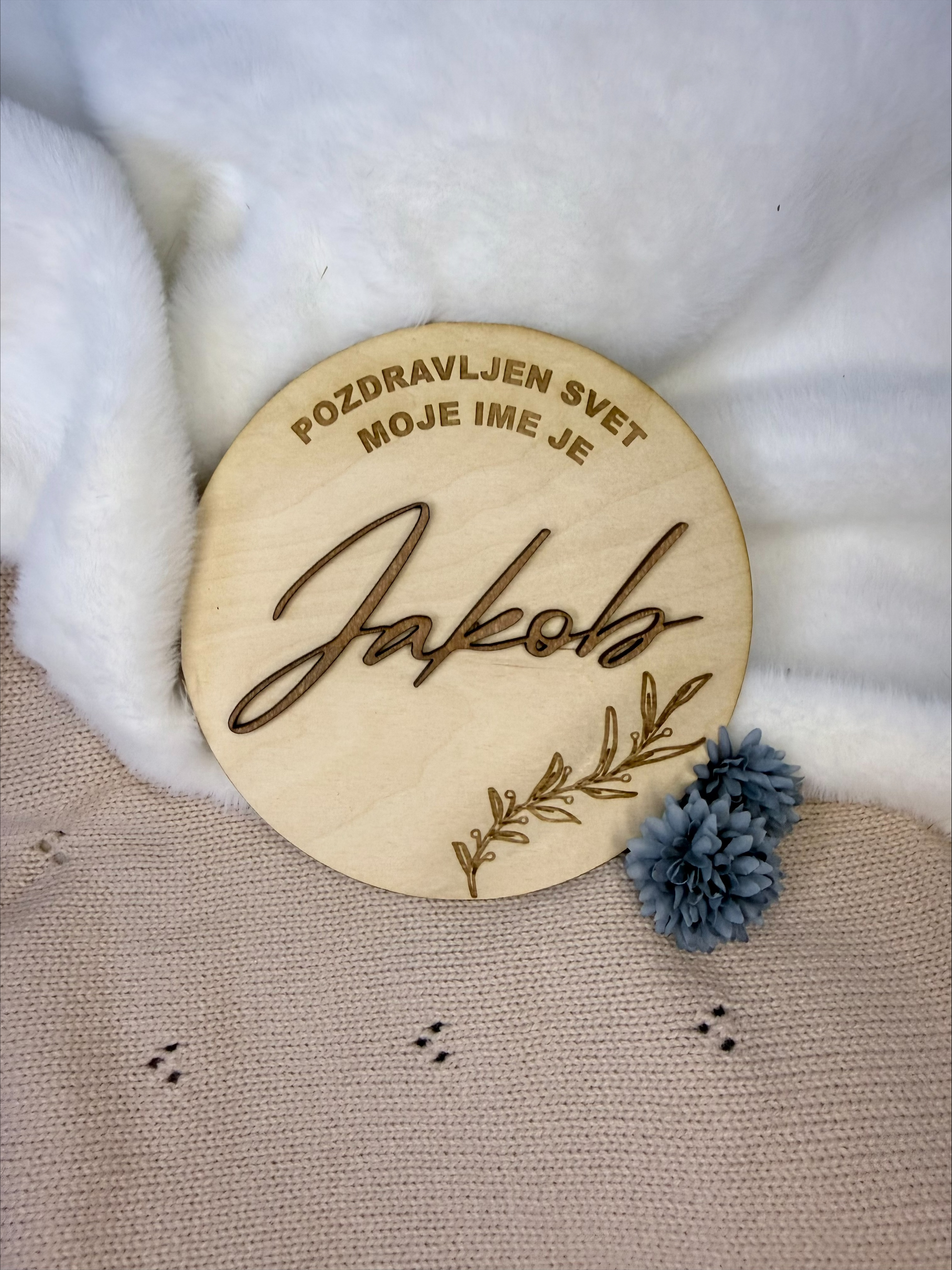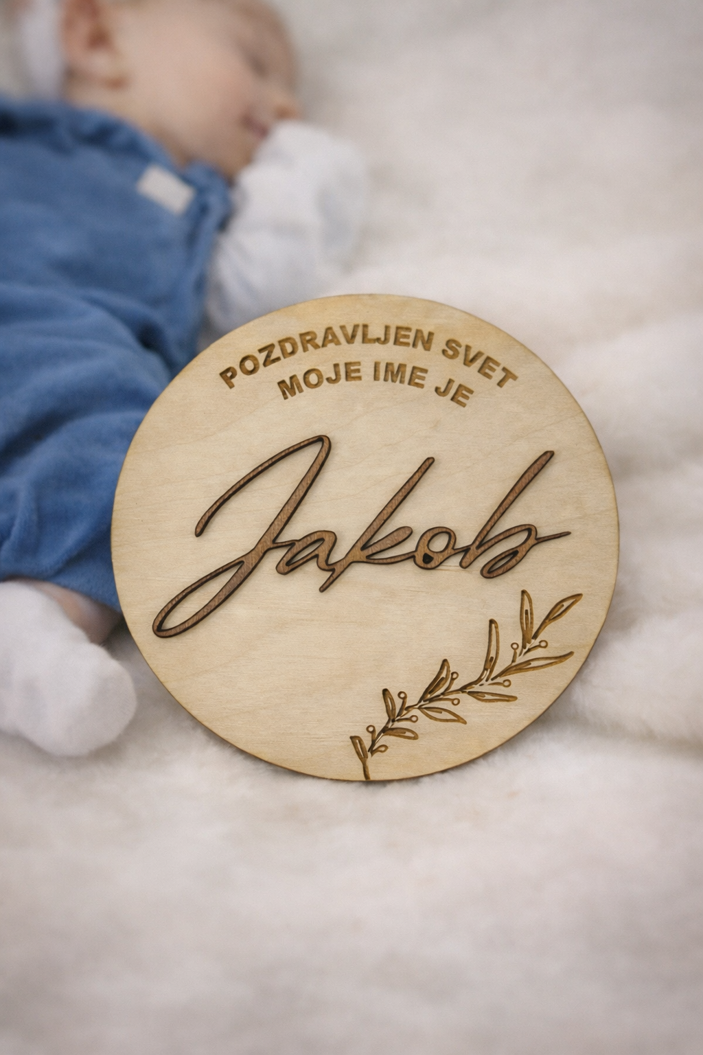 Kartica je izdelana iz naravnega lesa in okrašena z nežno gravuro. Ime je izrezano ter rahlo privzdignjeno, kar ustvarja lepo globino in eleganten videz. Zaradi minimalističnega in toplega dizajna se kartica lepo poda k različnim stilom fotografiranja – od naravnih in boho do klasičnih postavitev novorojenčkov.