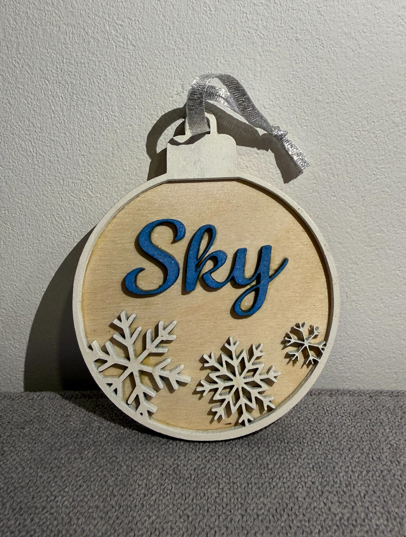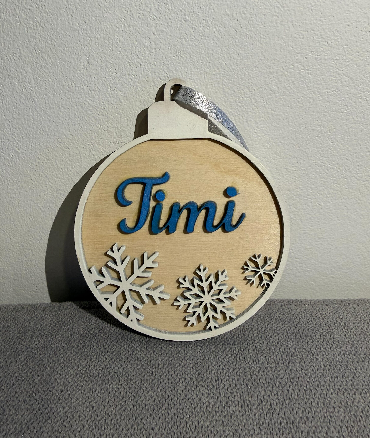 Nežen in eleganten božični okrasek v obliki snežinke, personaliziran z imenom po vaši izbiri. Izdelan je iz kakovostnega lesa in dopolnjen z barvnim napisom, ki okrasku doda poseben čar in igrivost.