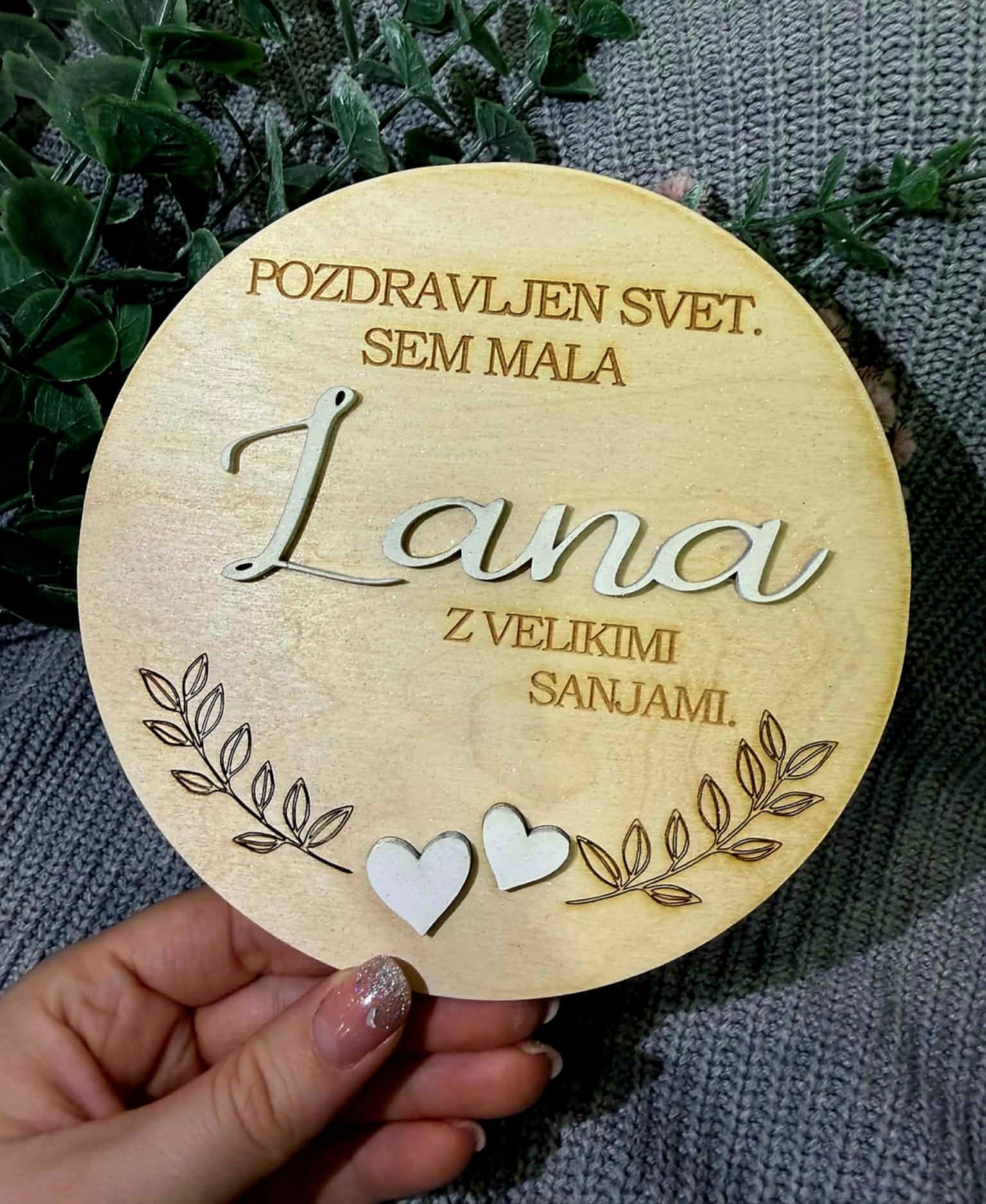 Na ploščico dodamo ime vašega otroka in poljubno sporočilo (npr. Pozdravljen svet, Sem mala …, Z velikimi sanjami). Tako ustvarite edinstven kos, ki je izdelan posebej za vas.