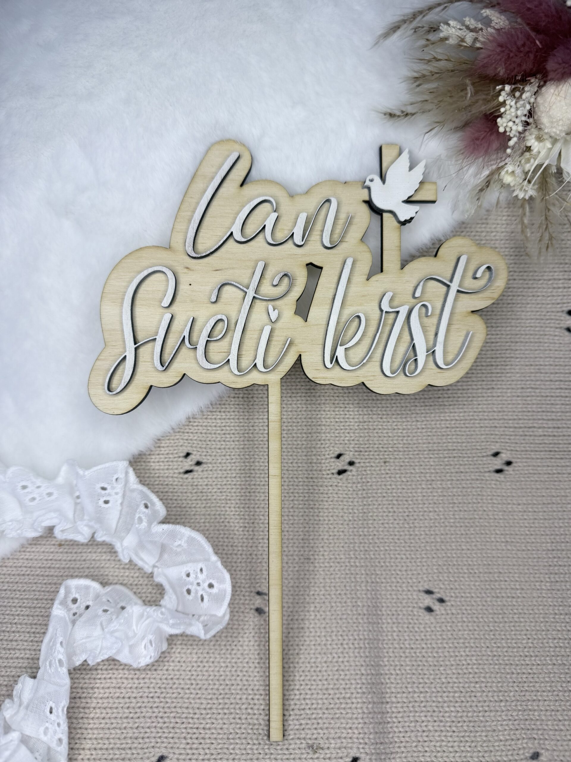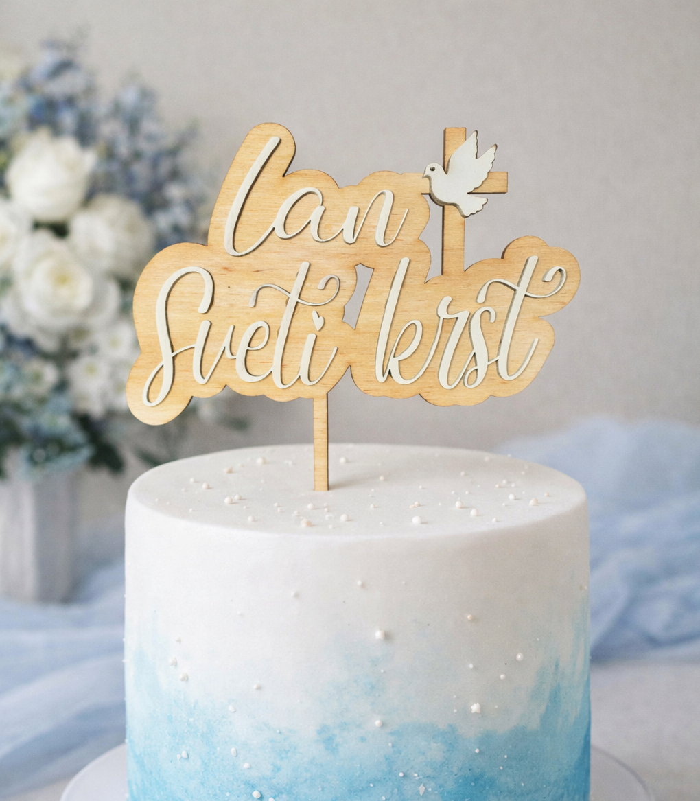 Svečan cake topper je čudovita in simbolna dekoracija za torto ob pomembnih zakramentih. Popolnoma se personalizira glede na zakrament (sveti krst, prvo sveto obhajilo ali sveta birma) ter ime slavljenca, zato je vsak kos edinstven in prilagojen vašemu praznovanju.