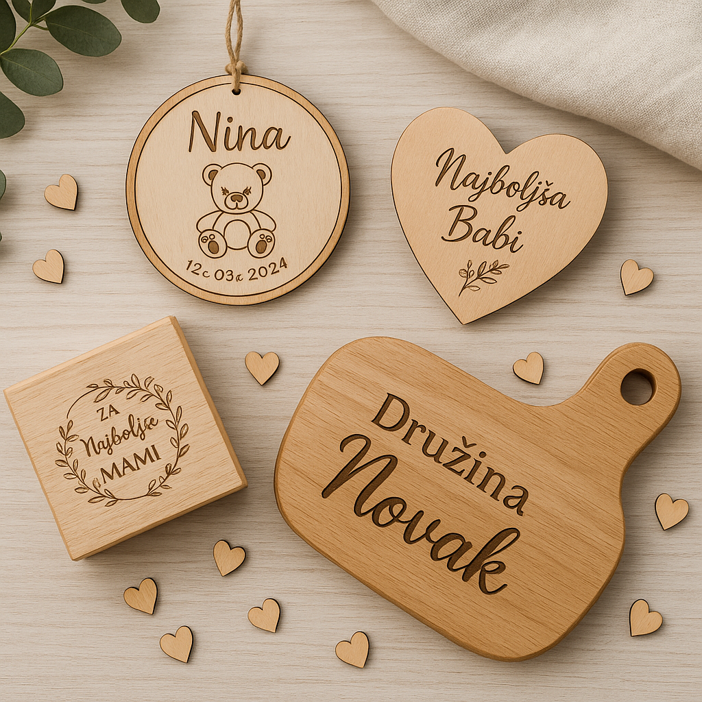 Vedno iščeva nove kombinacije materialov, tehnike graviranja in moderne dizajne, da ustvariva sveže, privlačne izdelke.